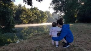 Dos años más tarde decidimos ser padres de nuevo y esta vez el embarazo llegó tras 3 meses de espera. Darme cuenta de este embarazo fue cómo recibir un regalo de la vida. Era el mes de agosto y estábamos de vacaciones en los Alpes con nuestra hija de 2 años. Nos fuimos de camping para vivir los más cercano posible a la naturaleza. Un día me fui de excursión con un grupo para hacer una caminata sensorial en el bosque. La última actividad que hicimos fue abrazar a un árbol y conectar con su energía. Dejarnos llevar por el momento, fluir con el entorno de paz que nos proporcionaba ese bosque, y estar aquí y ahora, en presencia. La luz era tenue, la temperatura agradable, y me había dado este tiempo tan valioso para estar conmigo misma y poder conectar. En ese momento supe que estaba embarazada. Sentí esta información llegar a mi cuerpo, como una certeza venida de la nada. Lo recuerdo como un momento de gran emoción, un momento único para mí y mi bebé. Unos días más tarde volvimos a casa e hice el test de embarazo. Mi intuición me había dado la verdad ese día en el bosque, estaba embarazada. En esta ocasión también decidí darle la sorpresa a mi marido.